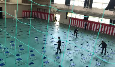 入学式に向けて、体育館の椅子も一つ一つ消毒をしました。