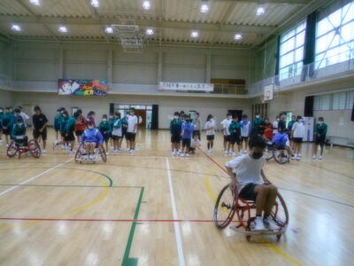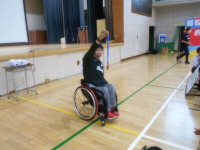 どれくらいの速さを出せるかの陸上競技用車いす(レーサー)の体験や車いすバスケットボールの競技用車いすを利用してのリレーを行いました。また、最後には「諦めない心」の大切さについてお話していただきました。