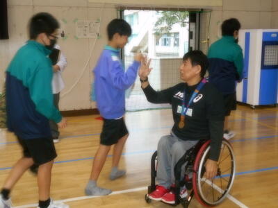 この事業は、パラスポーツを通じて、共生社会への気づきや学びを提供していただくパラスポーツ体験型出前授業です。今年も、陸上競技の永尾 嘉章(ながお よしふみ)さんに来ていただきました。永尾さんは、2004年のアテネパラリンピックで日本選手団の主将を務めるとともに、4×400mで銅メダルを獲得しました。