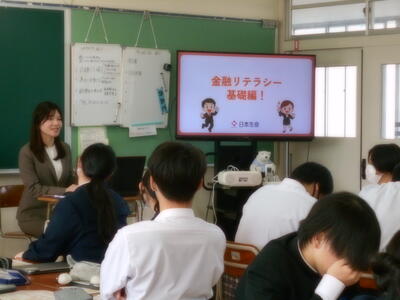 2月20日(金) 3年生が学習したのは、「金融リテラシー」です。金融リテラシーとは、日々の家計管理、将来の生活設計、適切な金融商品の選択(投資・保険・ローン等)、専門知識の活用など、安定した経済的自立と生活向上のためにお金に関する知識や判断力を身につけ、活用する能力です。今回は、生命保険会社の方からお話を聞きました。